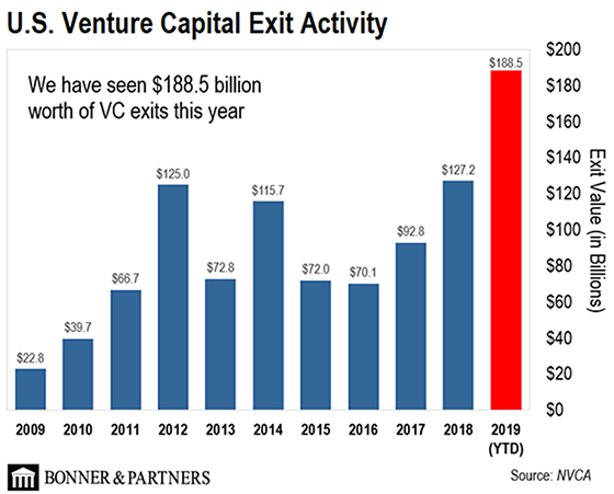 As you can see, the amount of venture capital flowing into private companies has been steadily rising since the early 2000s. VCs raised $156 billion in 2018 alone. And 2019 is shaping up to surpass that record.