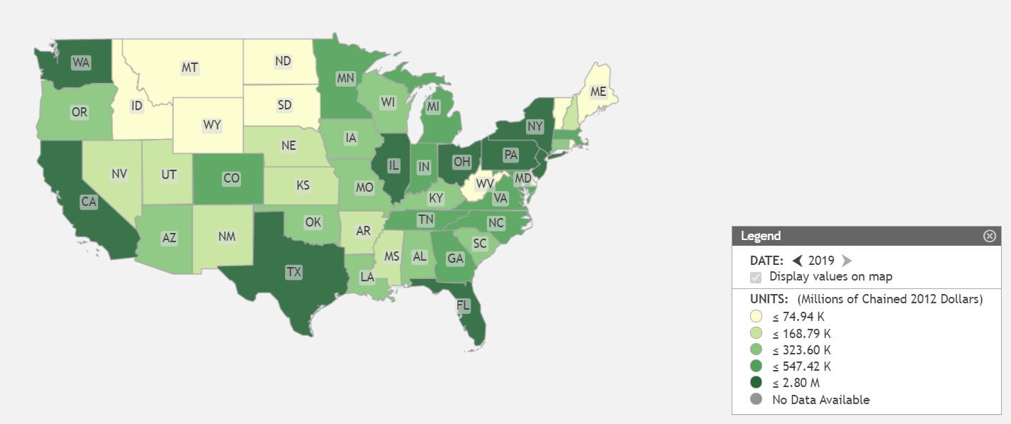 In terms of GDP, California is the largest state. It accounts for nearly 15% of the country’s GDP. Texas ranks a distant second at about 9%.