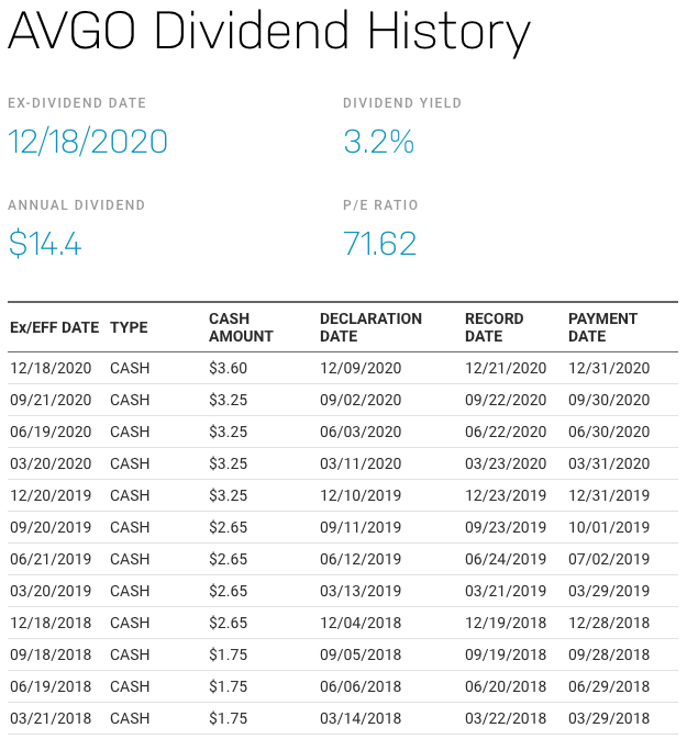 Broadcom Paid at Least a $3.25 Dividend in Each Quarter of 2020