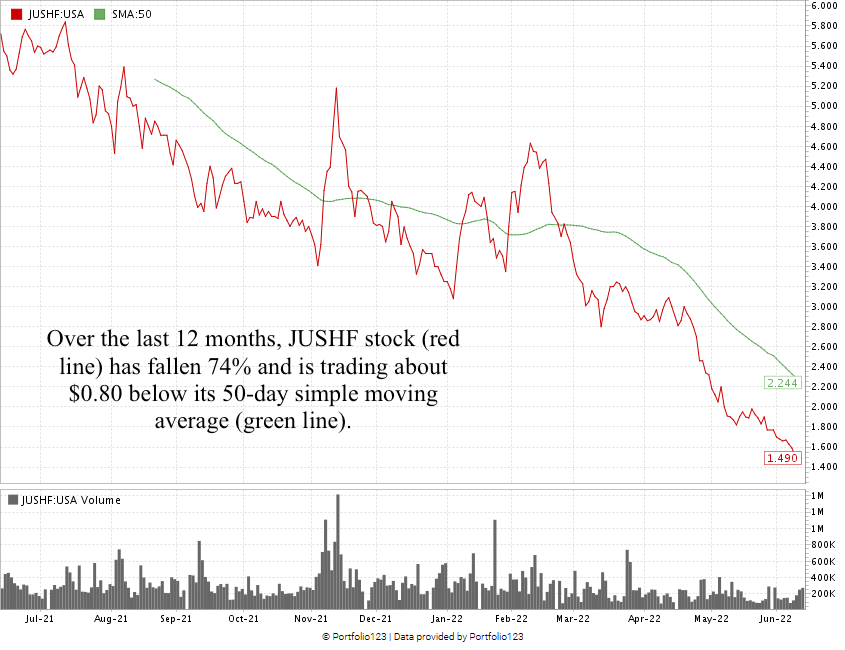 JUSHF has crashed 74% in the last 12 months. Monday’s 2% jump was nice to see, but it’s too soon to tell if this is a sustainable uptrend.
