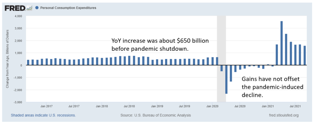 Before the pandemic, PCE showed steady growth of about $650 billion a year. Of course, spending plunged during the pandemic.