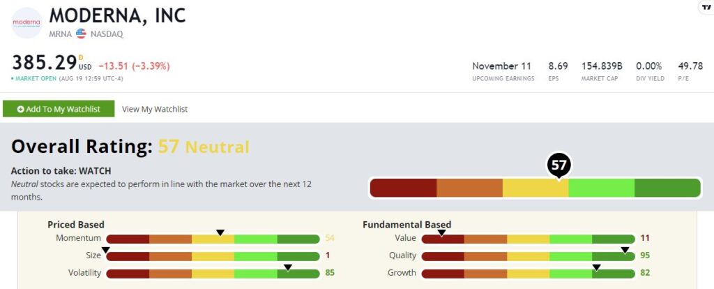 I highlighted Moderna Inc. (Nasdaq: MRNA) last month, noting that due to its short trading history, it doesn’t rate particularly high on our Green Zone Ratings system. But the stock scores very well in several of the factors that are less affected by short trading history, such as volatility (85) and quality (95). And perhaps most impressive is that Moderna rates an 82 on growth, despite being penalized by the lack of history.
