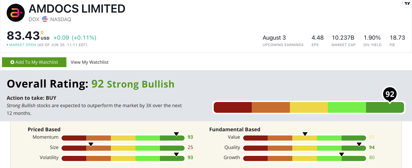 Amdocs Ltd. stock scores a 92 overall on our proprietary Stock Power Ratings system.