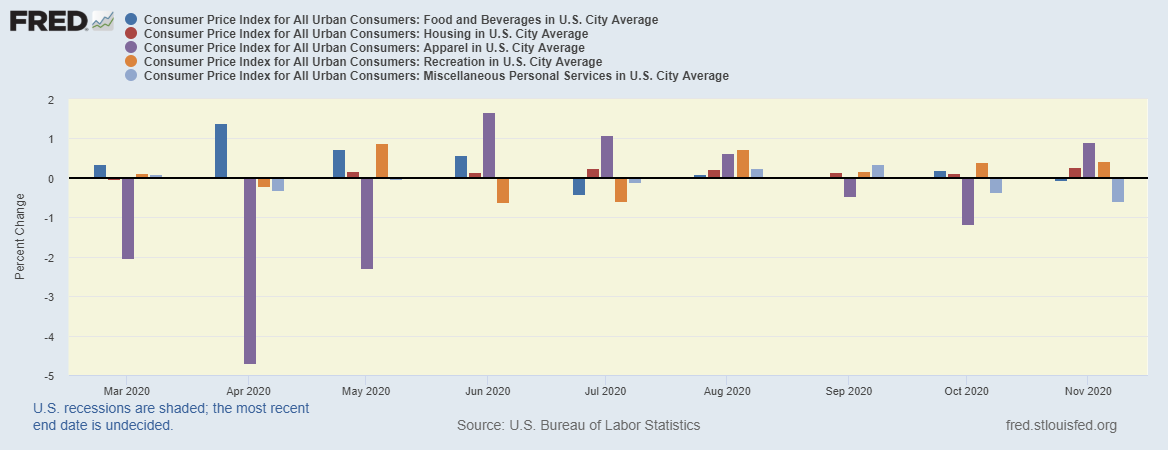 Apparel prices, the purple bar, shows strength in November, a sign that consumers could be shopping for clothes again. But it’s also possible this is a seasonal quirk since November requires winter clothes. December’s data will be important to watch for this category.