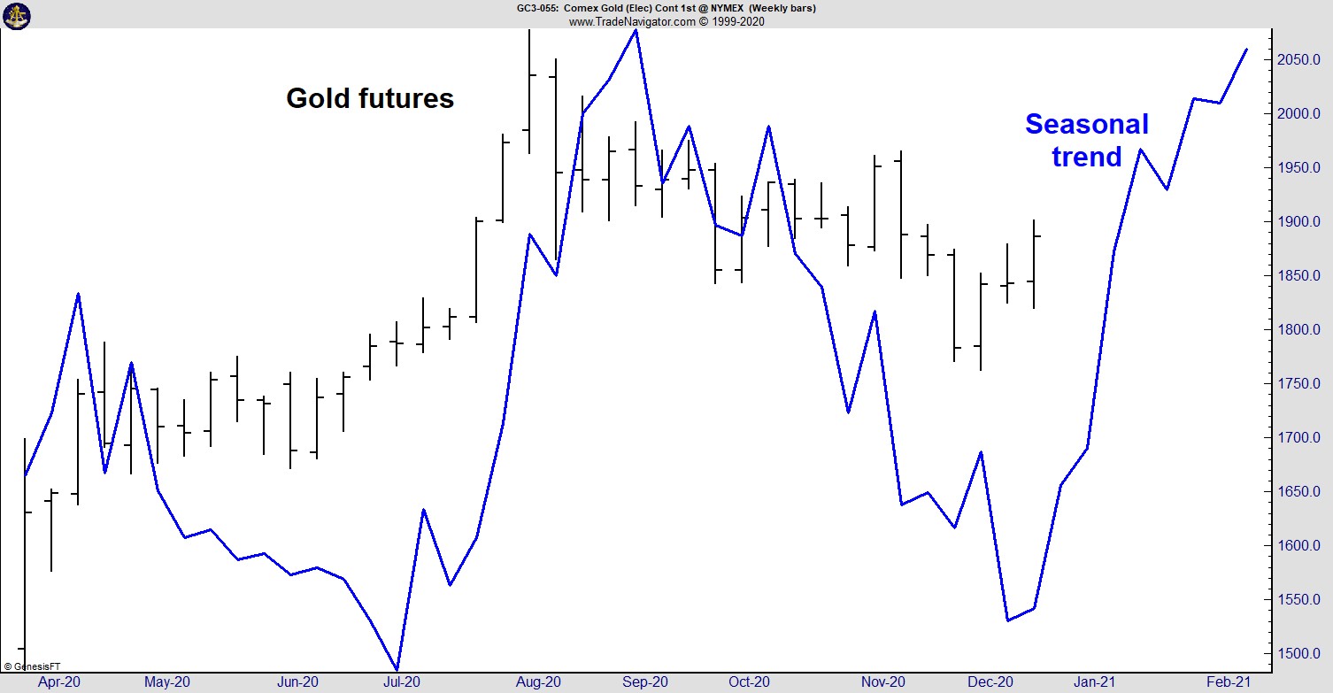 The chart below shows the price of gold futures as the black line and the seasonal trend in prices as the blue line. The seasonal trend is forecast for one year in advance.