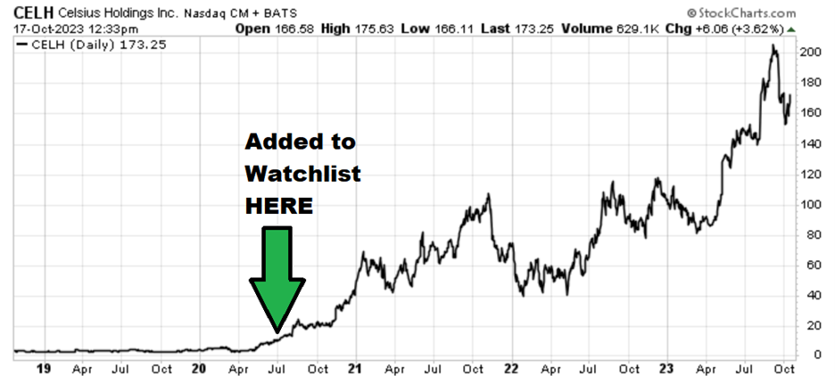 Since it first made our watchlist, Celsius has soared from $13.38 per share to over $166 before a 3-to-1 split in November 2023. That’s a massive 1,100% gain in just over three years!