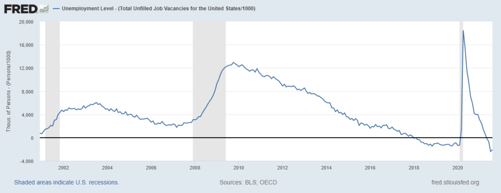At the end of October, there were over 11 million unfilled job openings in the country, far exceeding the number of unemployed, which stood at 6.9 million in the most recent report. There are 4.1 million more job openings than unemployed, a near-record reading of that measure as the chart below shows.