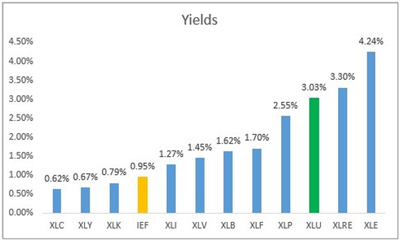 Here’s a chart of the yields paid by the major U.S. stock sector ETFs as well as the iShares 7-10 year Treasury Bond ETF (Nasdaq: IEF):
