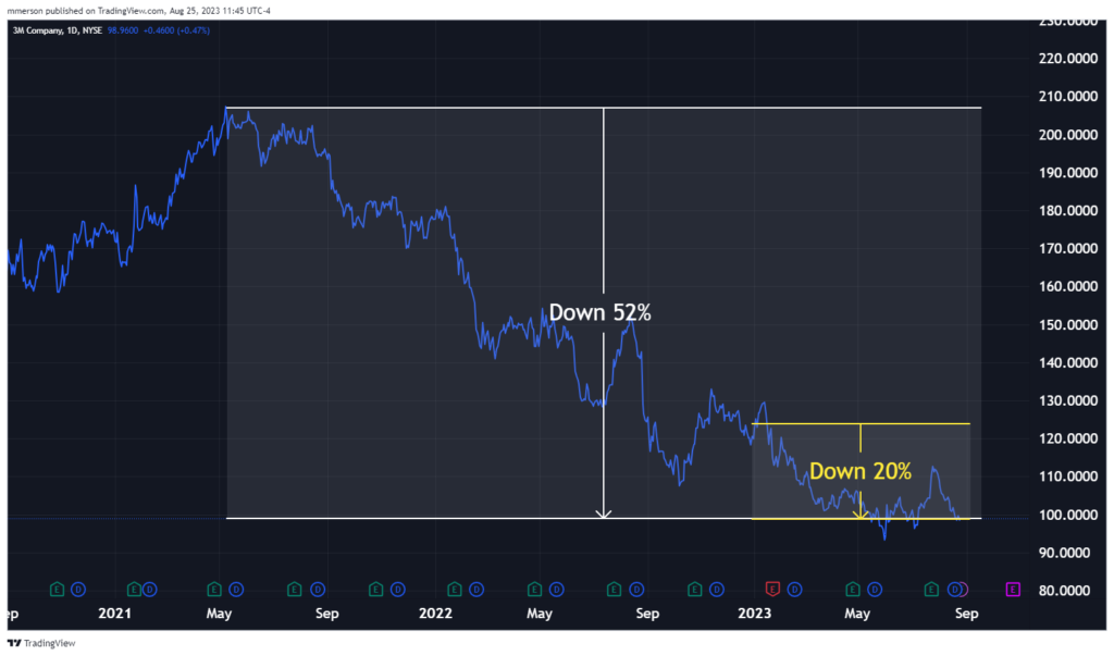 The stock currently pays out a 6% dividend yield — which sounds great … until you look at the price chart and realize MMM has fallen 20% this year … and a massive 52% from its 2021 top.
