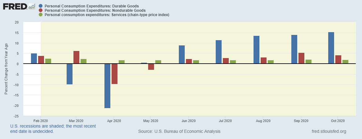 Purchases of nondurable goods reversed their gains after the initial buying pressure. I expect to see the same pattern in durable goods. After the surge in appliance shopping, I expect a smaller than average number of purchases next year.
